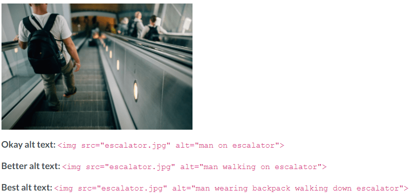 - Alt Text – Because Google can’t reliably understand what each image is (yet), they have a feature called alt text. It can be added to an image to help explain what the image is of. Most of the time search engines will be the only things to see at, but visually impaired visitors will most likely find it as well via screen readers. Very important.
